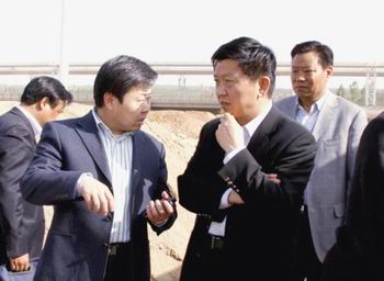 市委副書記、市長(zhǎng)楊樹平(前排右一)聽取三門峽公司總經(jīng)理?xiàng)钤ブ医榻B工程進(jìn)展情況