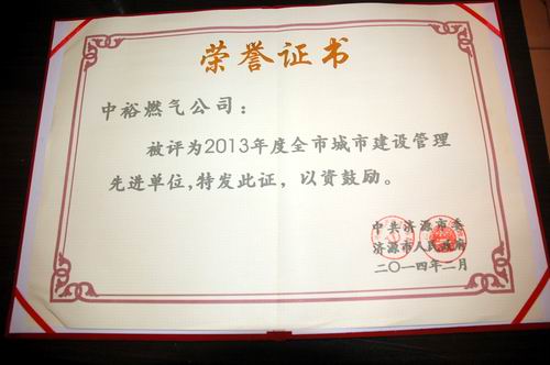 濟(jì)源公司訊 日前,濟(jì)源公司被濟(jì)源市委、市政府評為2013年度“全市城市建設(shè)管理先進(jìn)單位”。