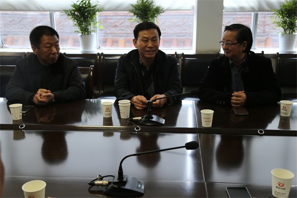 河南省住房和城鄉(xiāng)建設(shè)廳城建處副處長范軍付先生(中)、中國建筑學(xué)會建筑施工分會王新泉教授(右)、焦作市住房和城鄉(xiāng)建設(shè)局副局長李戰(zhàn)勝先生(左)聽取培訓(xùn)基地建設(shè)方案匯報
